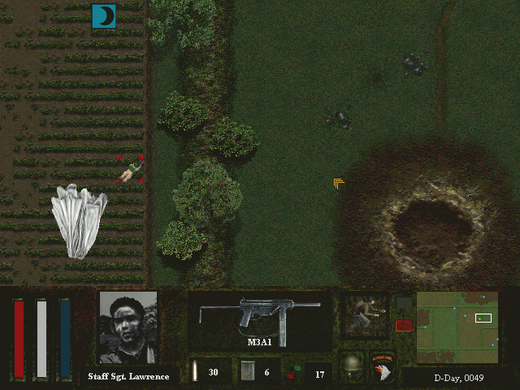 After all surviving units reach the ground the player respectively the AI moves one unit at a time. Every one has a certain amount of action points which decrease with every action, e.g. moving, resting, trading equipment or firing. The goal is always to liberate a certain area accompanied by a few optional tasks which have to be found during the mission. It is also important to note that the game uses fog of war and doesn't tell the player where his other units are. This means he has to orientate himself with a map - if one of the nearby soldiers has one in his equipment. After three days at most the mission ends and the player gets rated.