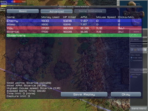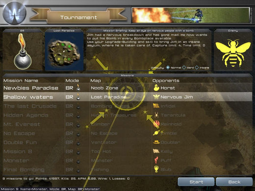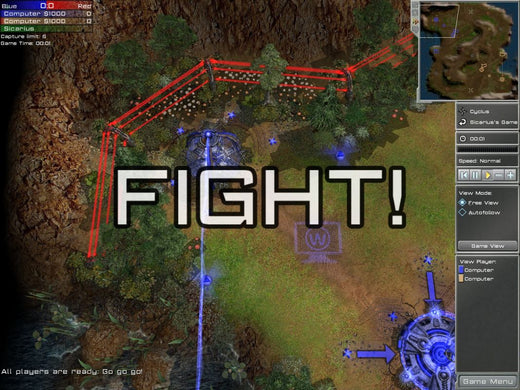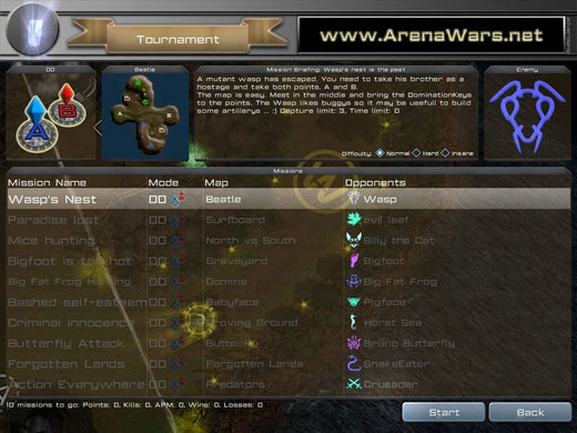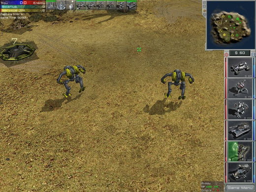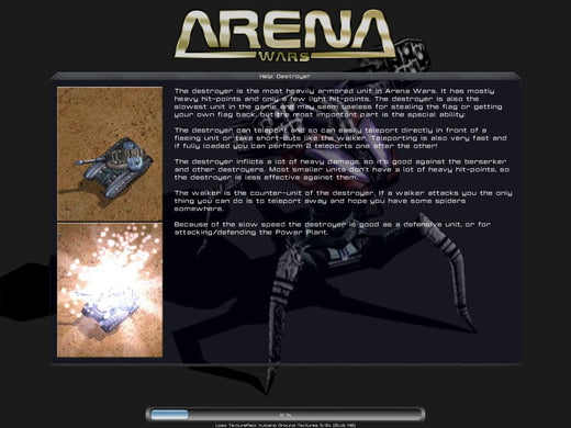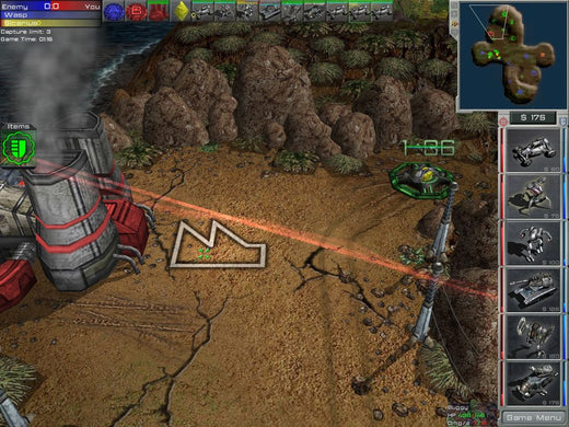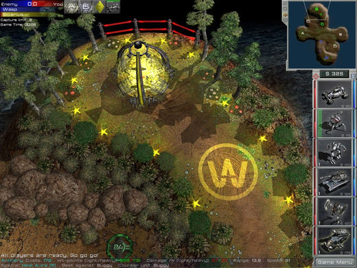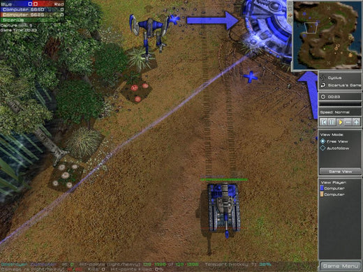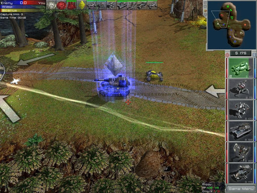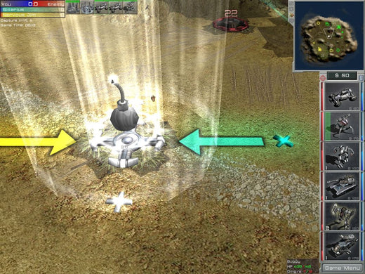 Arena Wars offers an unconventional mixture of RTS with FPS gameplay. Although something similar has been attempted with Savage, this game actually models its FPS part from multiplayer Arena-type titles, such as Quake III and UT2004. As a consequence, it has no real story and the RTS part is free from the usual resource constraints. All players have the same amount of money at their disposal and are refunded for destroyed units. However, the available unit selection is also somewhat limited. There are six types of units, all vehicular: mechs, light and heavy, an agile buggy, a missile launcher on wheels, a heavy tank and an artillery unit. Individual strengths and weaknesses aside, all units possess a special ability such as Teleport for tanks. The unit types form a predator-prey circle with each one being strong against a certain type and vulnerable against another.