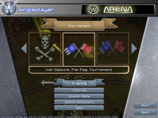 The game offers modes or events that are the mainstay of arena FPS competitions: Capture the Flag, Bombing Run and Double Domination. Unreal Tournament's influence on the game is obvious here. Arena Wars builds on the inherent tactical elements of these games and leaves the actual combat to the AI. It contains over 60 single player missions spread in six tournaments and multiplayer games for up to 8 players. In multiplayer the game offers webcam and voice support.
