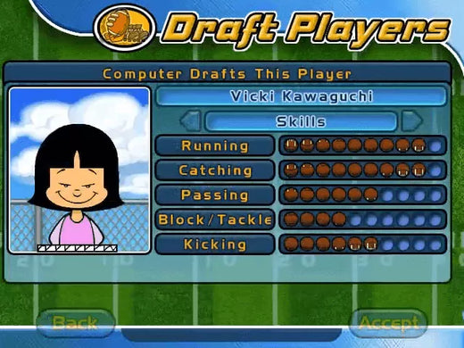 Backyard Kids! Pick your favorite players, NFL jerseys and fun fields… then, play in sunshine, rain, even snow. Call the right plays and become a Backyard Football’ hero.