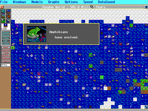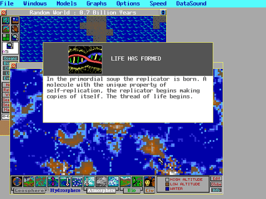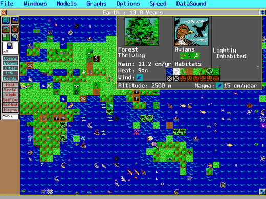 The main threats you face include pollution, disease, famine, war and global warming. The controls available to you include the chance to move mountains and continents, creating different levels of species, and unleash tidal waves and earthquakes so as to reshape your planet. All of these things take from your limited energy, which must be replenished.