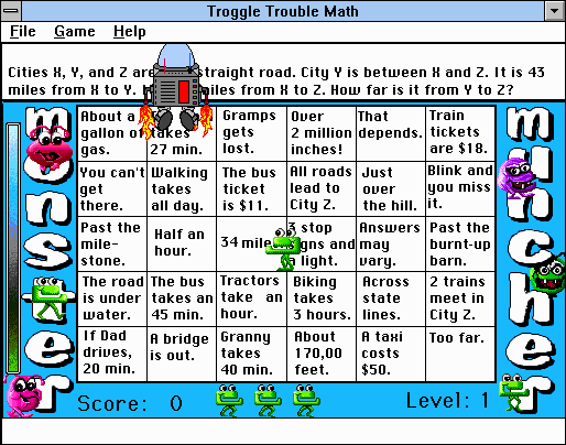 Troggle Trouble Math is a classic educational game from PC Gamez USA, designed for children to build essential math skills through fun, story-driven adventures on Microsoft Windows 3.X systems. Ideal for parents seeking engaging math software that combines learning with entertainment, this CD-ROM game offers a nostalgic way to spark a love for numbers.